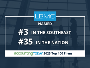 LBMC, a top accounting and business consulting firm in the nation, is pleased to announce its recognition as a 2025 Accounting Today Top 100 Firm, ranking 35th on the national list. The firm was also named a 2025 Accounting Today Regional Leader, securing the number three spot in the Southeast. These achievements underscore LBMC’s continued growth, commitment to innovation, and dedication to exceptional client service across diverse industries, reflected in its impressive 13.22% growth rate last year.