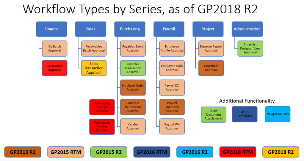 ​Often times, GP Users are not on most recent version of GP and I am often asked – “What workflows do I have available to me in my current version?” ​I put together a list of Workflows along with their release version, for your reference (and mine LOL).